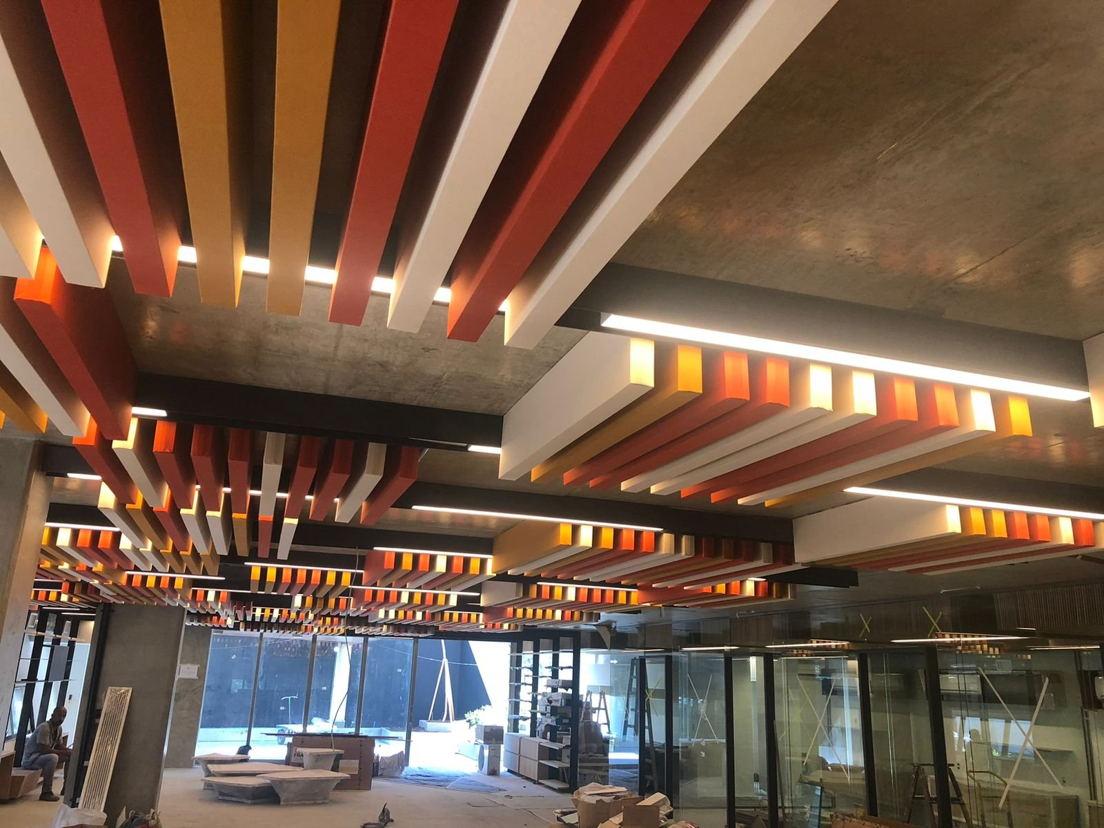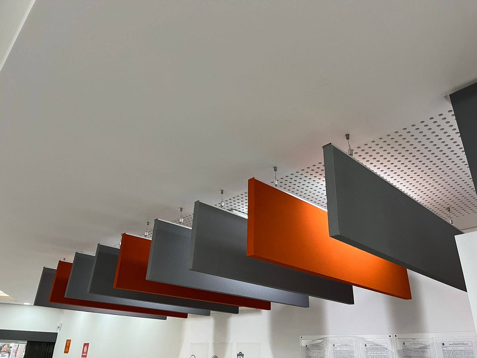 Painéis acústicos suspensos, instalados na vertical, tem a função de absorver esses ruídos desordenados, proporcionando uma redução de energia das ondas sonoras e evitando seu retorno ao ambiente.
